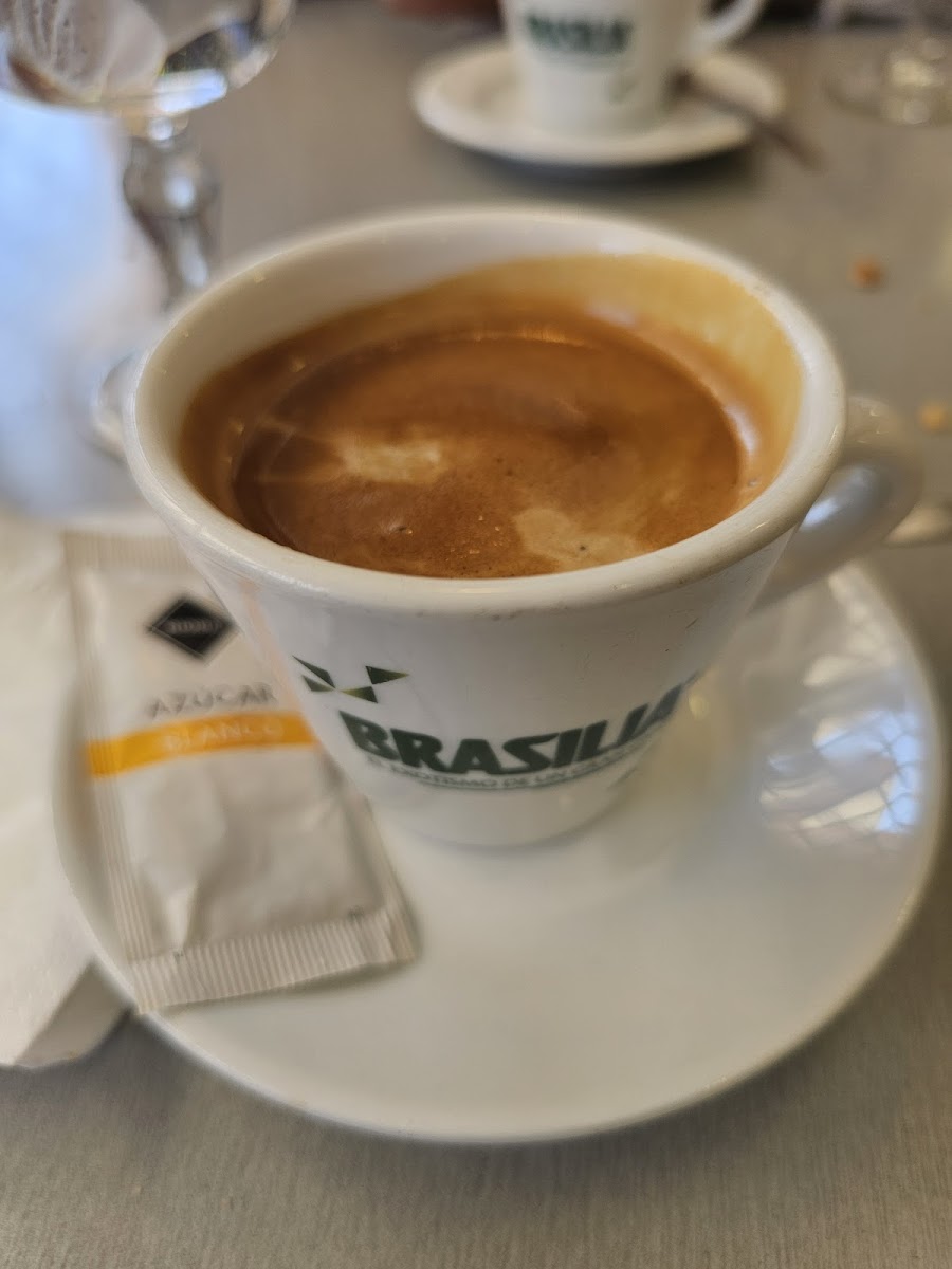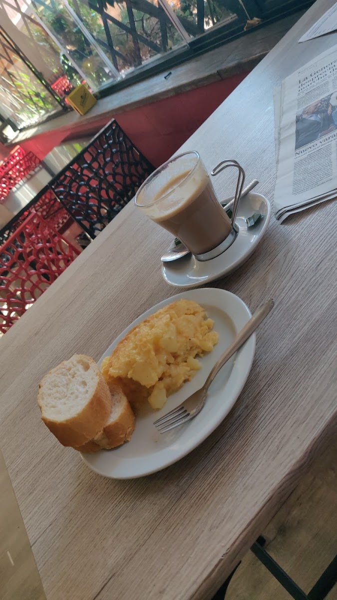 Reasonable, tasty, and convenient breakfast. My wife and I were at the adjacent hotel. The breakfast here was good and reasonably priced - two of us ate for less than 10 euros. We had the tortilla (Spanish omelette) which was good but not the best that I have had. Unlike many bar tortillas it was moist which was a positive. Served with a bit of bread it makes a nice breakfast but we shared it and each had chocolate (the nice thick kind) and porras. The chocolate was appropriately thick but not the best I have had. The porras were a new experience as I am used to churros. I prefer the porras and these were _great_ for dipping in the chocolate. I would return in a heartbeat and it was clear that many in the neighborhood do.